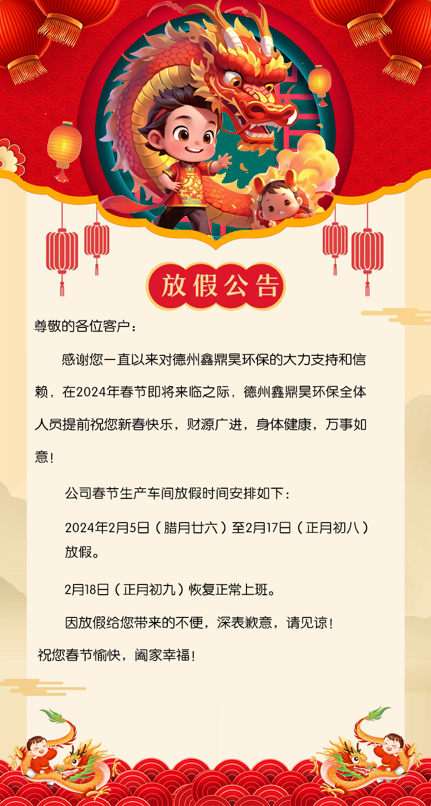 感謝您一直以來對德州鑫鼎昊環保的大力支持和信賴,在2024年春節即將來臨之際,德州鑫鼎昊環保全體人員提前祝您新春快樂,財源廣進,身體健康,萬事如意!