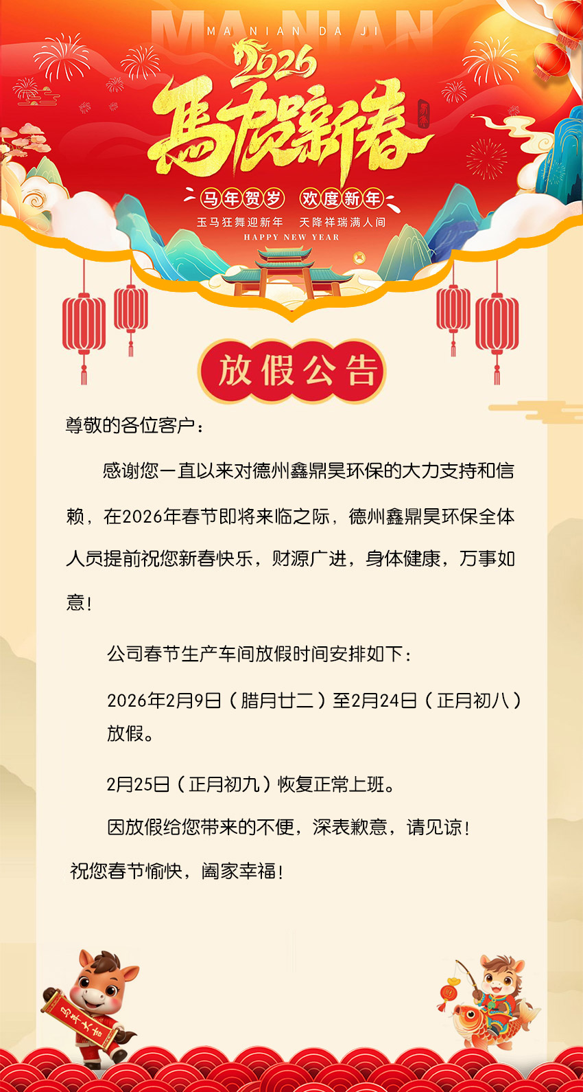> 德州鑫鼎昊環保2026年春節放假通知