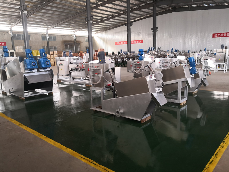 2、脫水:經(jīng)過(guò)濃縮的污泥隨著螺旋軸的轉(zhuǎn)動(dòng)不斷往前移動(dòng);沿泥餅出口方向,螺旋軸的螺距逐漸變小,環(huán)與環(huán)之間的間隙也逐漸變小,螺旋腔的體積不斷收縮;在出口處背壓板的作用下,內(nèi)壓逐漸增強(qiáng),在螺旋推動(dòng)軸依次連續(xù)運(yùn)轉(zhuǎn)推動(dòng)下,污泥中的水分受擠壓排出,濾餅含固量不斷升高,終實(shí)現(xiàn)污泥的連續(xù)脫水。